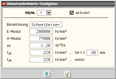 können benutzerdefinierte, von den aktuellen Standardparametern abweichende Werkstoffeigenschaften festgelegt werden. |