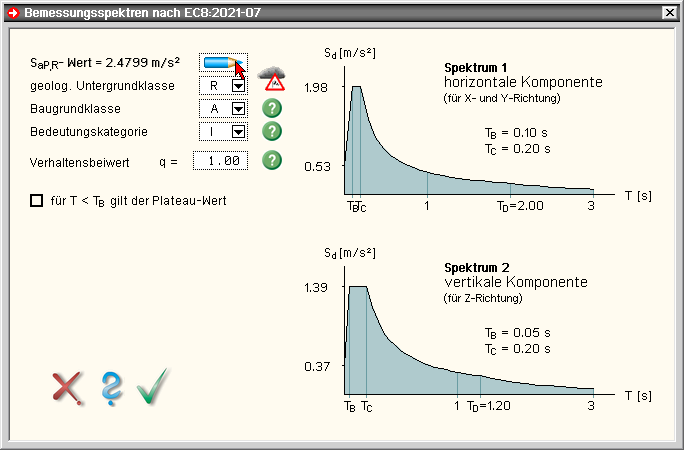 | Der maßgebliche anzugebende Wert ist SaP,R, der den Plateau-Wert des Bemessungsspektrums für die geologische Untergrundklasse R, die Baugrundklasse A und die Bedeutungskategorie II darstellt. |