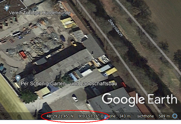 Lesen Sie nun in der Fußzeile (siehe Markierung im o. a. Snapshot) die Koordinaten ab und übertragen
