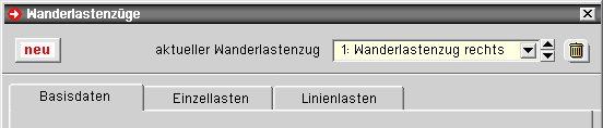 (neu-Button), zur Auswahl eines bestehenden Wanderlastenzugs (Auswahlliste) und zum Löschen des aktuell