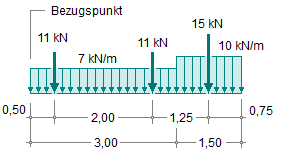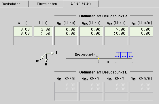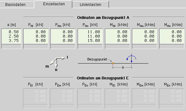 | Im Register Einzellasten werden die Einzellasten (Abstand vom Bezugspunkt und Lastordinaten) beschrieben. Die Anzahl