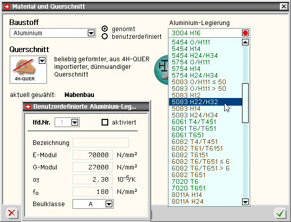 | Neben den ca. 100 Legierungen der Norm können benutzerseits indivuelle Parameter weiterer Aluminiumlegierugen vorgegeben werden. |