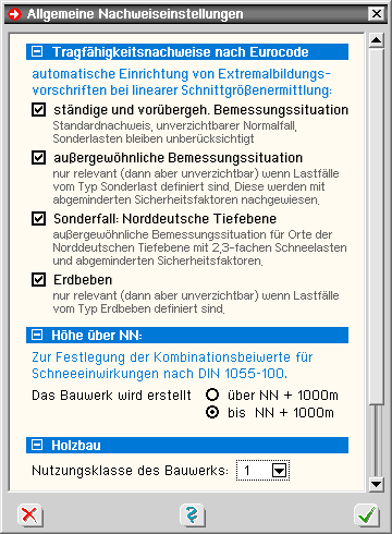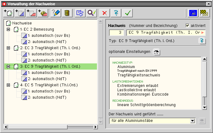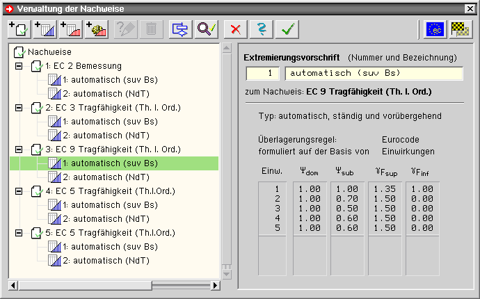 | Auch in der Verwaltung der Nachweise steht nun ein Assistent bereit, über den die automatische Einrichtung der Extremalbildungsvorschriften für ständige und vorübergehende und außergewöhnliche Bemessungssituationen sowie den Sonderfall Norddeutche Tiefebene und Erdebeben gesteuert wird. |