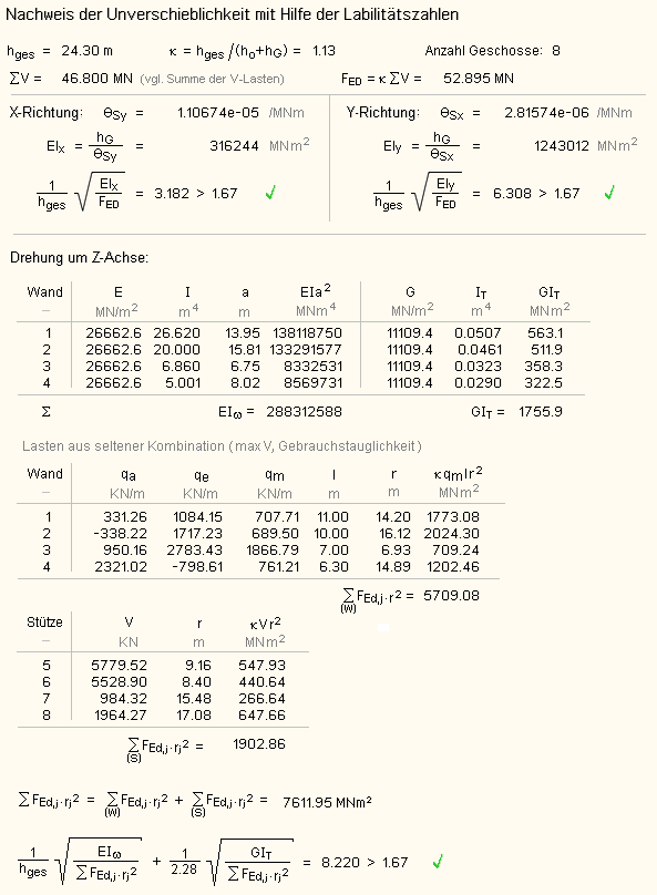 Erdbebenlasten und Labilitätszahlen dar. |