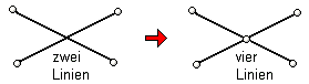 | Wenn Linien sich schneiden, muss im Schnittpunkt der Linien ein Punkt erzeugt werden, mit dem die vier verbleibenden Linienenden verknüpft werden. |