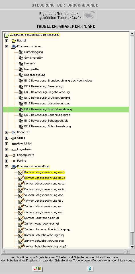 in den Fenstern Ergebnisse und Tabellen/Grafiken/Pläne bestimmten Ausgaben in der Ergebnisdruckliste