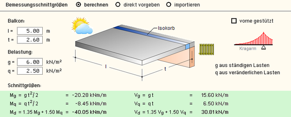 Im linken Teil werden der Verlauf sowie die für die Isokorb-Bemessung wesentlichen Extremal-