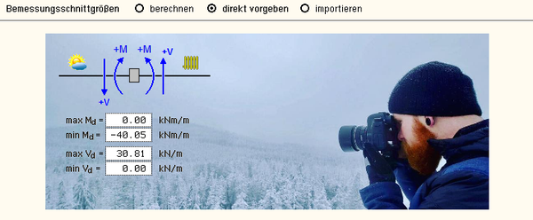 | Die Bemessungsschnittgrößen können direkt vorgegeben, an einfachen Modellen