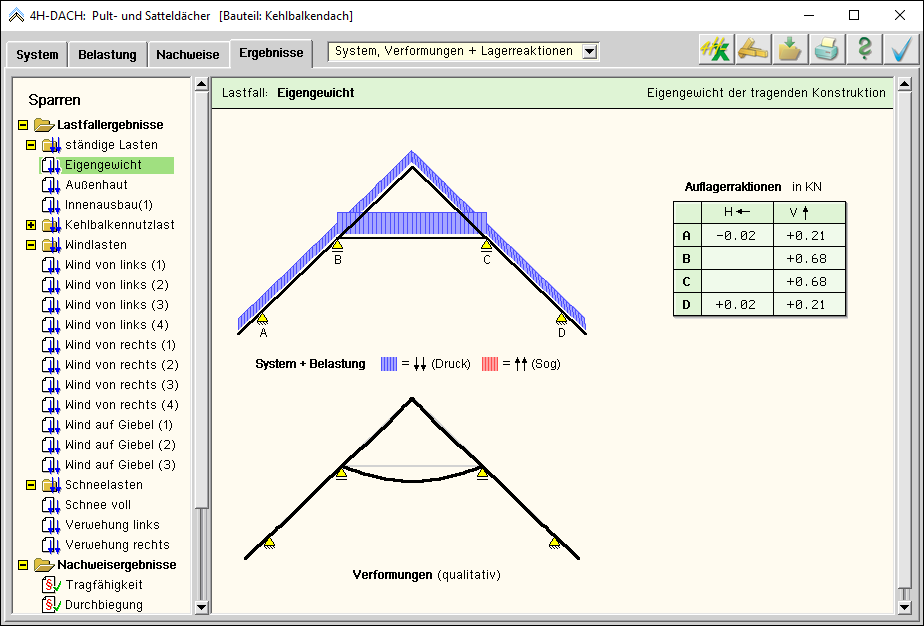 4H-DACH, Pult- / Satteldach, Lastfallergebnisse - System, Verformungen und Lagerreaktionen