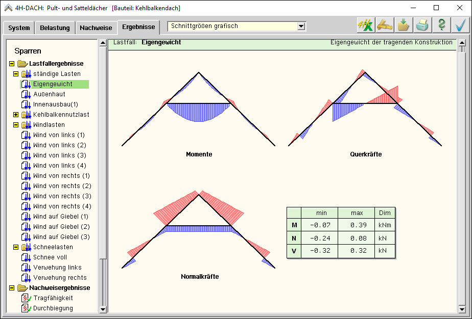 -DACH, Pult- / Satteldach, Lastfallergebnisse - Schnittgrößen grafisch