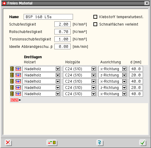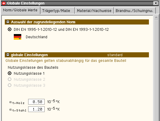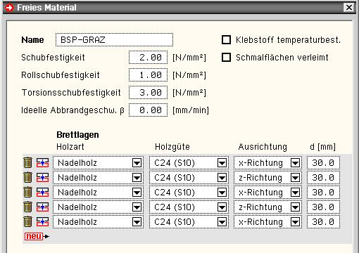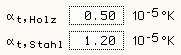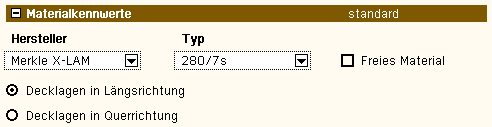 Holz und Stahl sind mit sinnvollen Werten vorbelegt, können