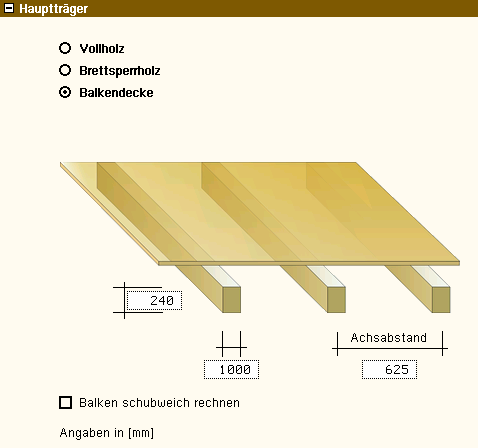 Bei Vollholz oder Balkendecken kann gewählt werden, ob Schubverformungen