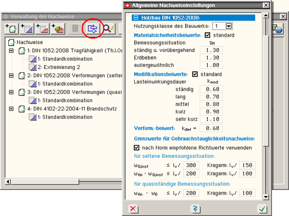 Eigenschaftsblatt für Holzbaunachweise unter der Überschrift globale Einstellungen zur Bearbeitung angeboten. |