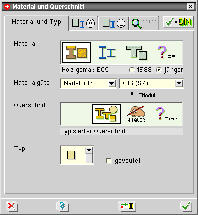 Bei Holzquerschnitten muss zunächst die zugrunde liegende Norm (EC 5, DIN 1052 2008 oder auch noch 1988) ausgewählt werden. (Eigenschaftsblatt s.o.).