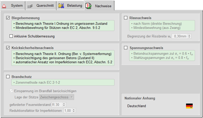 Berechnung und Bemessung können über Auswahlboxen für Beton- und