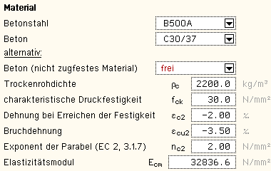 | Anschließend werden die Eingabeparameter und die Materialsicherheitsbeiwerte bzw. Bemessungsgrößen ausgedruckt. |