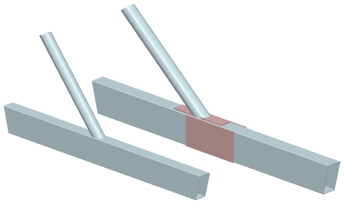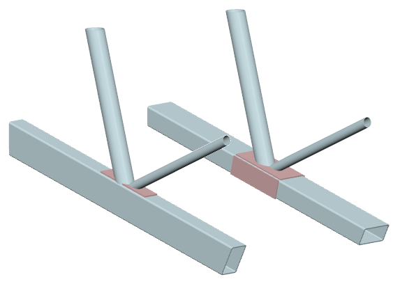 ... zwei Streben mit Rechteckrohrquerschnitt werden rechtwinklig an einen Gurt mit Kreisrohrquerschnitt angeschlossen