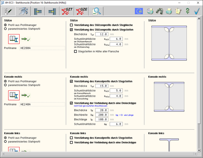 | Im zweiten Registerblatt werden Stützen- und Konsolprofil ausgewählt. |
