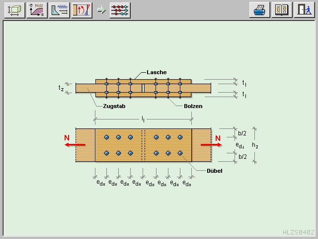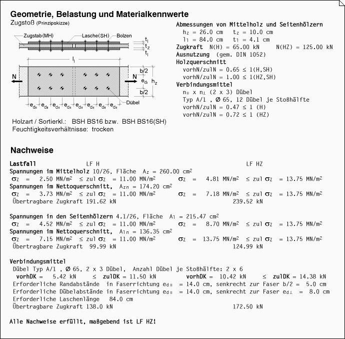 Dieser Abschnitt zeigt das Eingabefenster für den Bauteiltyp Zugstoß und das fertig gesetzte Ergebnisprotokoll