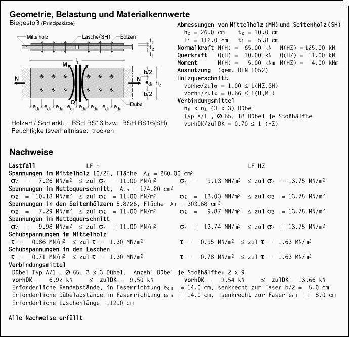 Dieser Abschnitt zeigt das Eingabefenster für den Bauteiltyp Biegestoß und das fertig gesetzte Ergebnisprotokoll