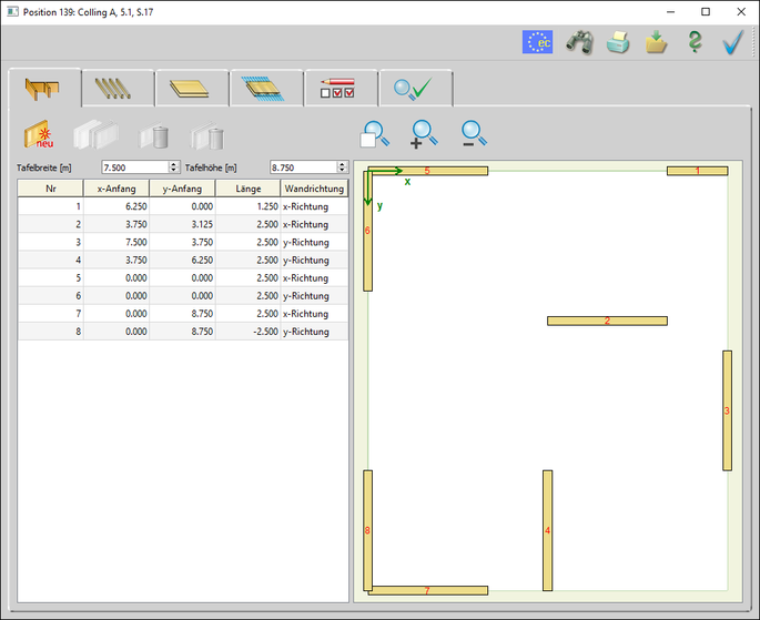 | Wände können durch einen Klick in die betreffende Zeile oder