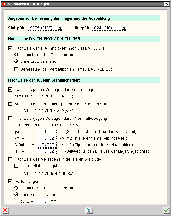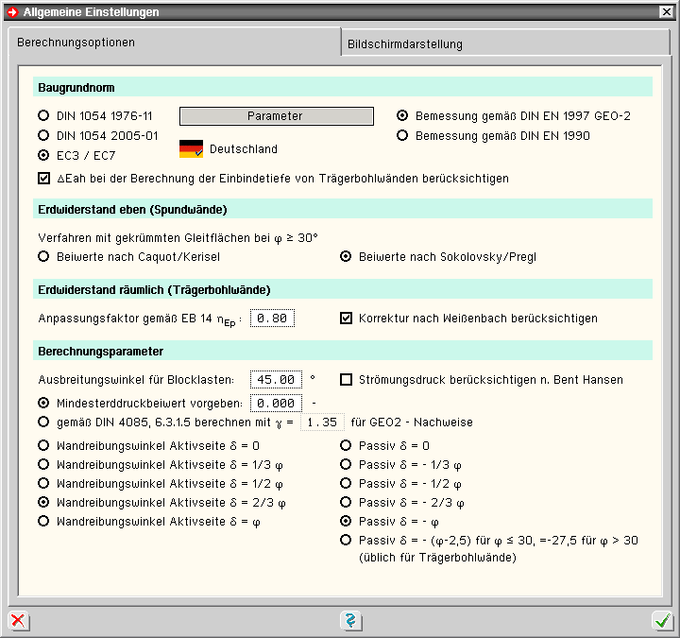 Die Berechnung kann nach den Baugrundnormen DIN 1054, Ausgabe 1976-11, DIN 1054, Ausgabe 2005-01,