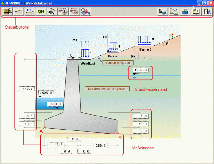Berechnung von Winkelstützwänden aus Stahlbeton. |
