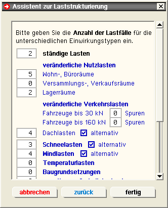 Eigenschaftsblatt Lastfallanzahlen der unterschiedlichen Einwirkungstypen