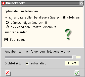 Da man i.d.R. beim erstmaligen Aufruf nicht weiß, ob es sich der Berechnungsmehraufwand lohnt, kann der Testmodus aktiviert werden. Die Angaben zur nach-folgenden Netzgenerierung können auf automatisch belassen werden.