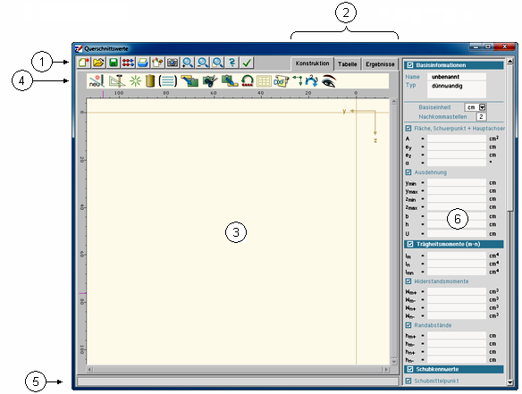 Dies ist der Normalmodus von 4H-QUER. Hier können Querschnitte mit grafischen Hilfsmitteln konstruiert werden. Entsprechende Werkzeuge werden bereitgestellt.