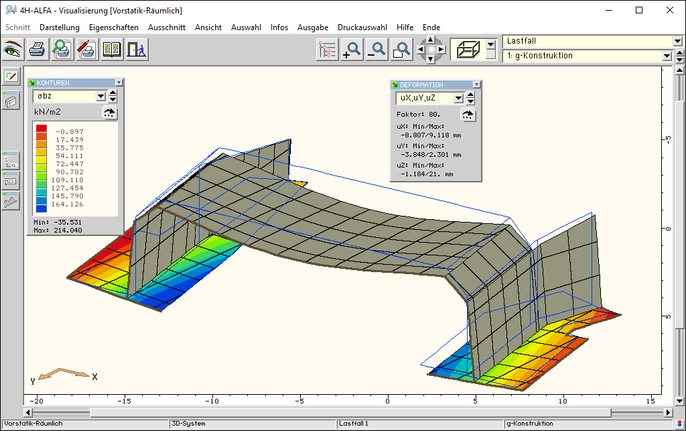 mit der Konturflächendarstellung der Durchbiegung senkrecht zur jeweiligen Positionsebene unterlegt. |