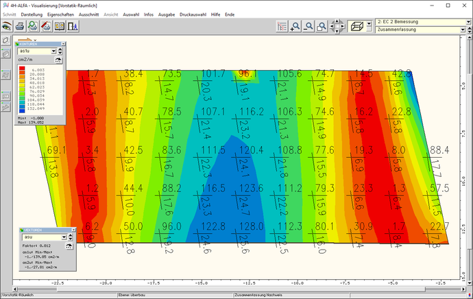 dargestellten Werte - z.B. Hauptmomente, -normalkräfte, -querkräfte, Bewehrungen in Verlegerichtung. |