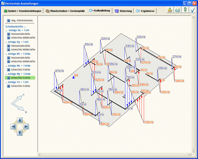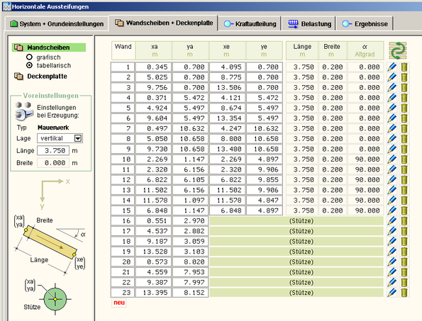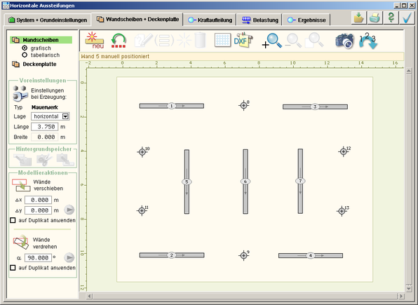 | Die Hauptsteuerung erfolgt über die Register System + Grundeinstellungen, Wandscheiben + Deckenplatte, Kraftaufteilung, Belastung, und Ergebnisse. |