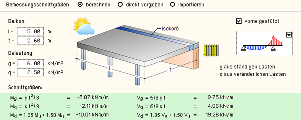 Im linken Teil werden der Verlauf sowie die für die Isokorb-Bemessung wesentlichen Extremal-