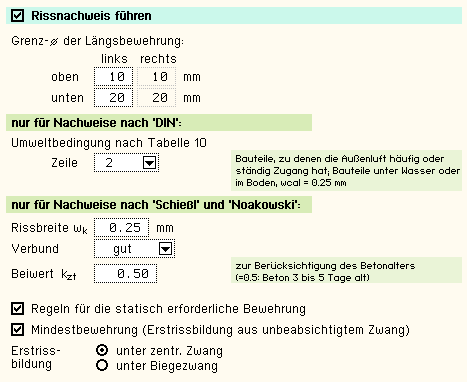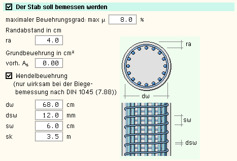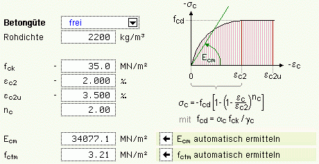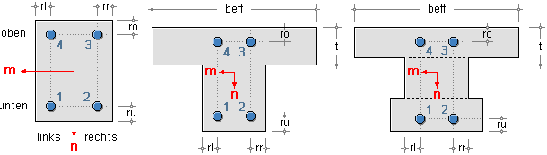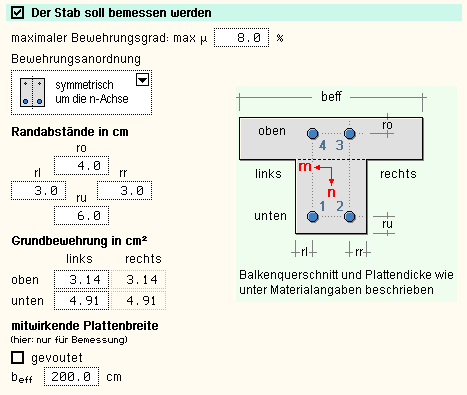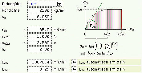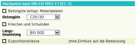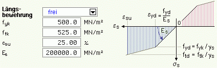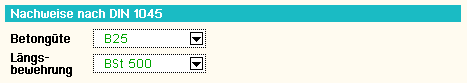 | In Auswahlboxen werden die möglichen Beton- und Betonstahlsorten für die Längsbewehrung