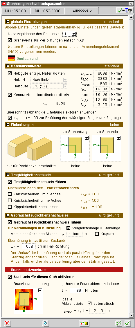 Im nachfolgend dargestellten Eigenschaftsblatt können die möglichen holzspezifischen Nachweisoptionen