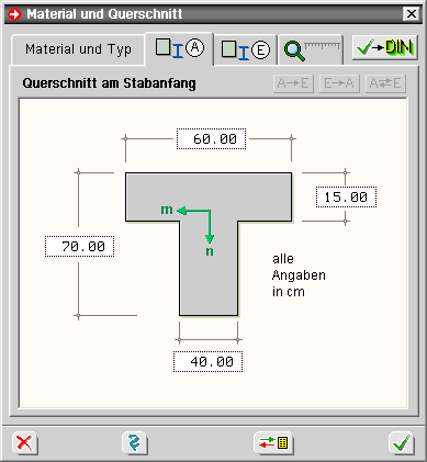 Wird der nebenstehend dargestellte Button angeklickt und sind aktuell Stäbe ausgewählt, erscheint das Eigenschaftsblatt zur Festlegung der Material- und Querschnittsangaben auf dem Sichtgerät.