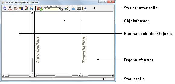 Hauptfenster ist in die Steuerbuttonzeile, die Statuszeile sowie