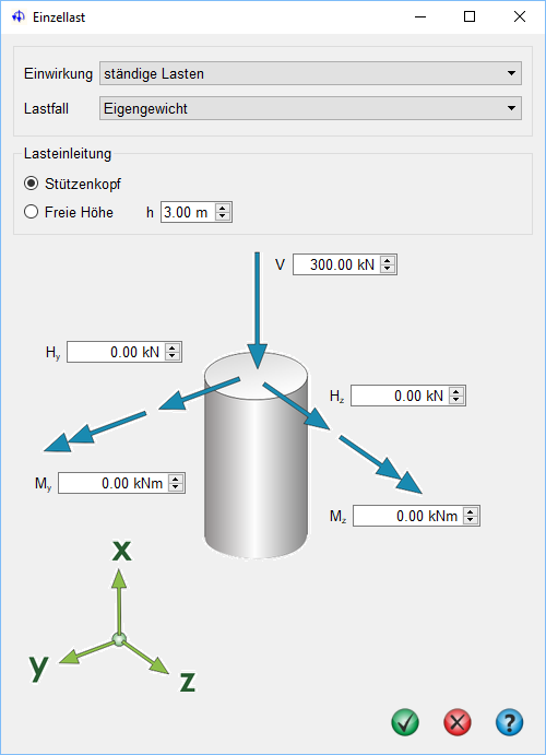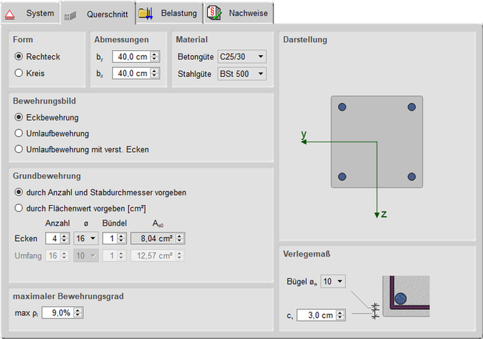 | Als Querschnittsform kann zwischen Rechteck und Kreis gewählt werden. Die zugehörigen Abmessungen in den entsprechenden Achsrichtungen bestimmen sich aus den Angaben zu by bzw. bz. |