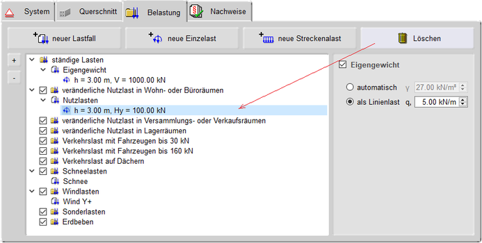 und Lastfalleigenschaften sowie einer tabellarischen und grafischen