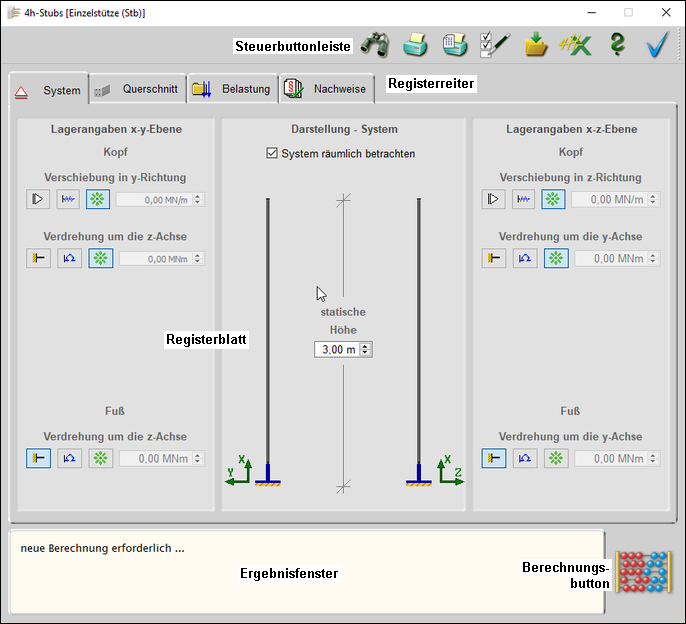 | Über die Registerreiter erreicht man die vier Registerblätter System, Querschnitt, Belastung und Nachweise. |