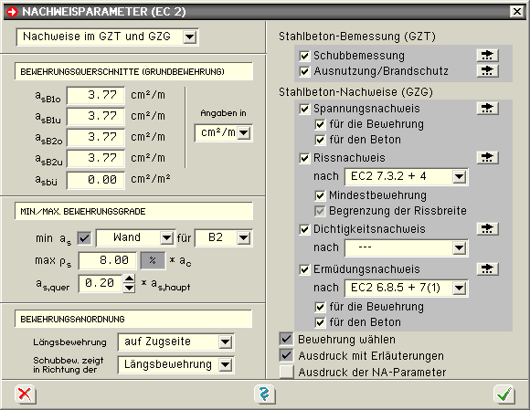 Werden die Schub-, Ausnutzungs-, Riss-, Spannungs-, Schwing-/Ermüdungs- oder Dichtigkeits-Buttons aktiviert, sind weitere Parameter unter dem bearbeiten-Button