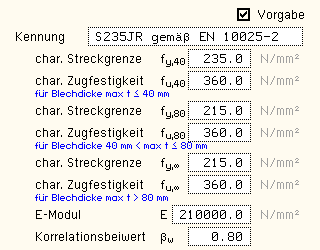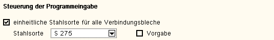 sowie der Stahlgüten aus; bei Aktivierung der zusätzlichen