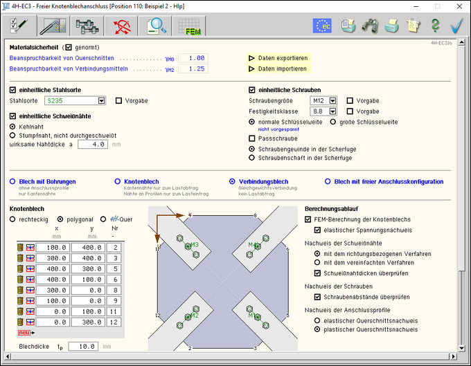Das Programm 4H-EC3FK, Knotenblech mit freier Anschlusskonfiguration, weist die Tragfähigkeit eines Knotenblechs und seiner Anschlussstäbe unter ebener Beanspruchung entspr. Eurocode 3 nach.