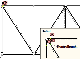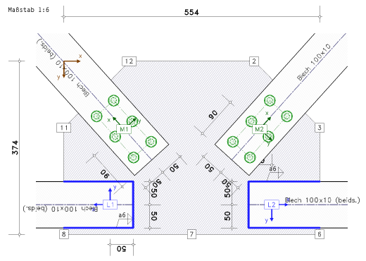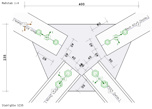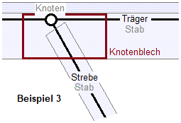 | Im Zentrum des Knotenblechs treffen die Wirkungslinien der