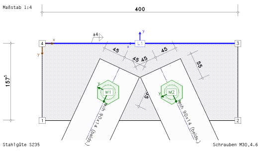 | Die Schrauben sind durch die Streben mit einer Kraft Fx = +/- 150 kN belastet. |