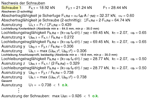 Beanspruchung der Schrauben einschl. Anschlussprofil (Usc = 87%). |