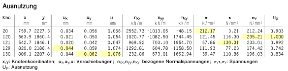 Schub- und Vergleichsspannungen, die der Spannungsausnutzung zu Grunde liegen, protokolliert. |
