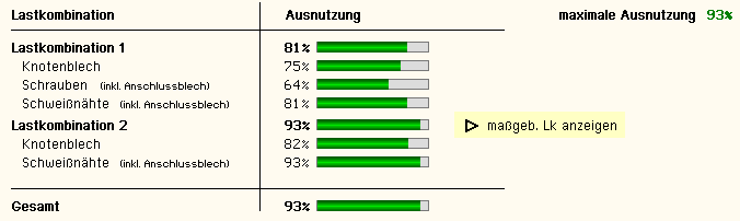 die Ergebnisse (Ausnutzungen) lastfallweise und detailliert