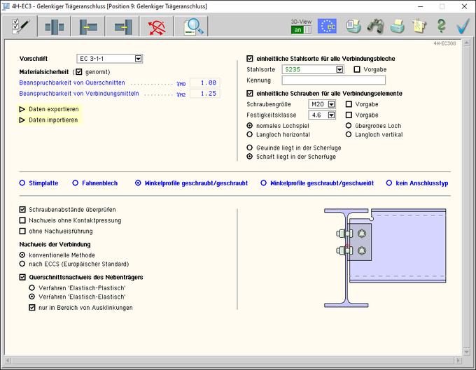 Das Programm 4H-EC3GT, Gelenkige Trägeranschlüsse, berechnet einseitig oder beidseitig gelenkig